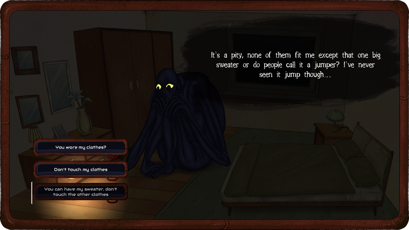This was such a fantastic game! It was the perfect amount of funny, romantic and horror. Loved the art, and the animation was so smooth. I can't wait to see what you guys make next!